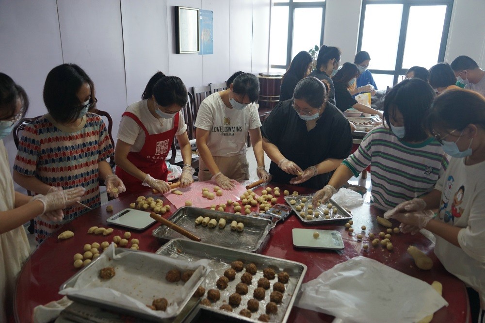 在群團(tuán)組織的帶領(lǐng)下,大伙兒一起親身體驗(yàn)做月餅的樂趣,現(xiàn)場熱鬧非凡,氣氛活躍喜慶。公司不乏做月餅高手,在她們點(diǎn)撥下,大家信手拈來,人人化身月餅師傅,揉粉、搟皮、做餡、包裹、上色、烘焙……一個(gè)個(gè)精美的月餅在手中呈現(xiàn),空氣中洋溢著滿滿的成就感。