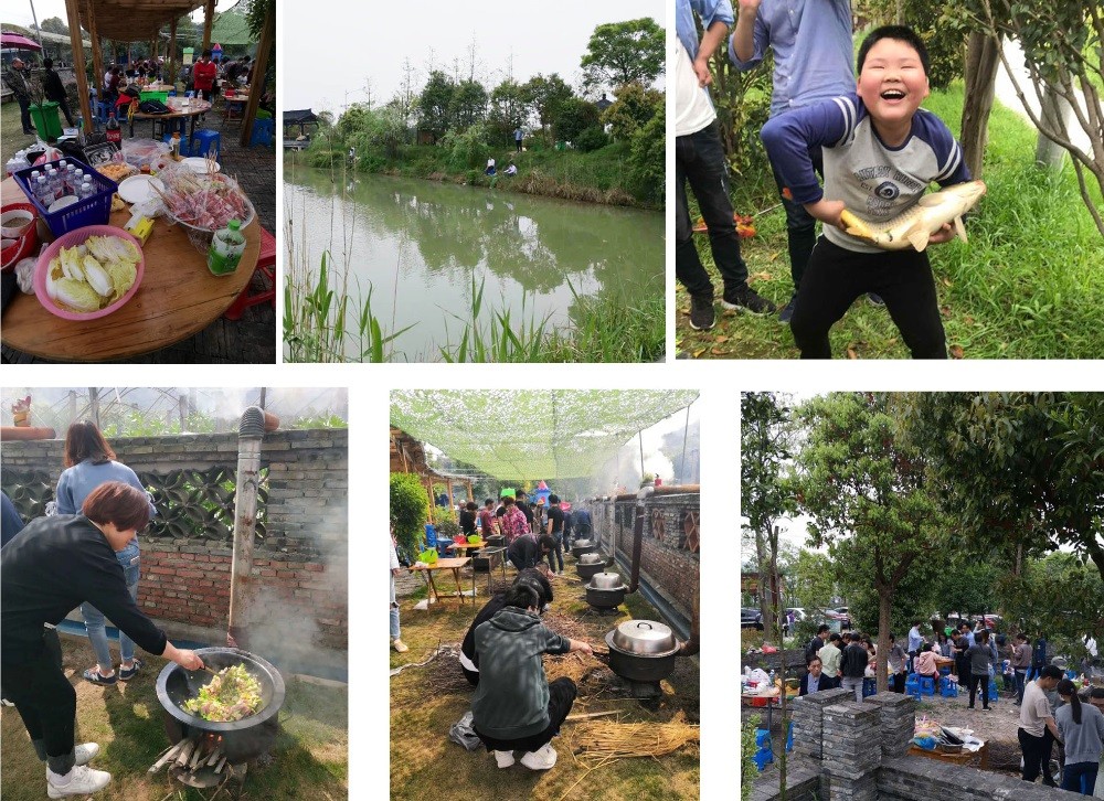 這次活動的地點(diǎn)是尖山金家農(nóng)莊,那里景色秀麗,有蜿蜒的長廊,荷蘭風(fēng)車,孩童玩的滑滑梯,共有大人小孩100多人參加了活動。喜歡釣魚的一大早趕到農(nóng)莊,拿出自己的優(yōu)良漁具占領(lǐng)有利地勢,拋出桿,開始享受釣魚的快樂。莊主家也早已經(jīng)幫助準(zhǔn)備好了食材,年長一點(diǎn)的員工都有燒飯的經(jīng)驗(yàn),尤新仙、沈利仙、俞建強(qiáng)等組員負(fù)責(zé)燒野飯,在農(nóng)家的土灶上,燒起了柴火,一個(gè)個(gè)大大的鐵鍋里,放上油,炒起了咸肉、春筍、蠶豆、豌豆、香腸,菜炒熟后放上米和水,隨著時(shí)間的推移,隨之而來的香噴噴的野飯味撲鼻而來;年輕一點(diǎn)的負(fù)責(zé)燒烤,大家分工明確,團(tuán)結(jié)協(xié)作,雖然大家是新手,但是還是有不少人參加過燒烤活動,有一點(diǎn)點(diǎn)經(jīng)驗(yàn)的,在其中儼然就成了師傅,爭著做起了大師傅,把烤串刷上油、香料烤了起來,燒烤網(wǎng)上烤串放得滿滿的,引得旁人垂涎三尺紛紛投來羨慕和貪婪的眼光。每組烤的骨肉相連、羊肉串、雞翅等一一出爐,大家相互吆喝著請其他組人員來吃自己家烤的東西,紛紛夸贊自己組烤得好吃??镜摹⒊缘?、串門的、看的、拍照的,每個(gè)人都樂在其中……