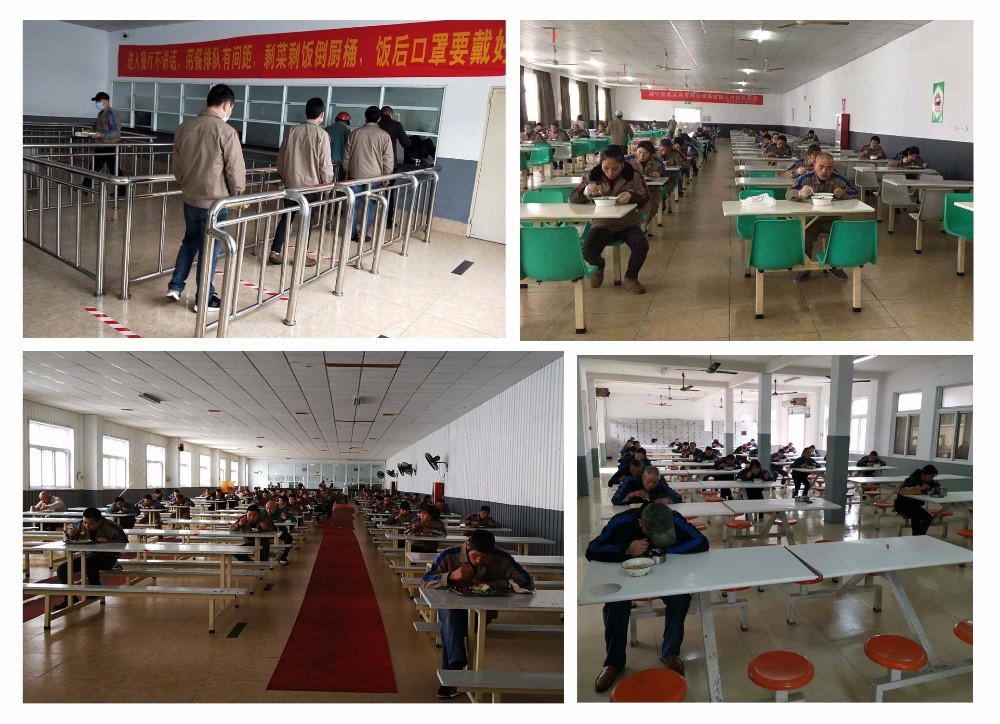 各子公司想方設(shè)法進行就餐管理,有的實行車間分餐制和辦公室就餐制,用一次性餐盒送餐到車間或自帶餐具到辦公室就餐,并統(tǒng)一回收;在食堂就餐的,實行錯時就餐,有序排隊領(lǐng)餐,各自分散吃飯,地上有一米線區(qū)間標識,桌上也標有座位隔離線,保持一米以上距離,有的一人一桌,禁止互相聊天,提升了文明安全等級。