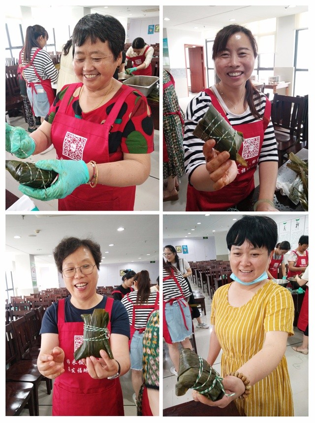 一切準(zhǔn)備就緒,包粽子活動(dòng)正式開始啦,每一位女能手都鉚足了勁頭,拿粽葉、填糯米……片刻,一片片清香的粽葉、一粒粒晶瑩的糯米,在一雙雙巧手下轉(zhuǎn)眼就變成了玲瓏可愛、各具特色的誘人粽子。
